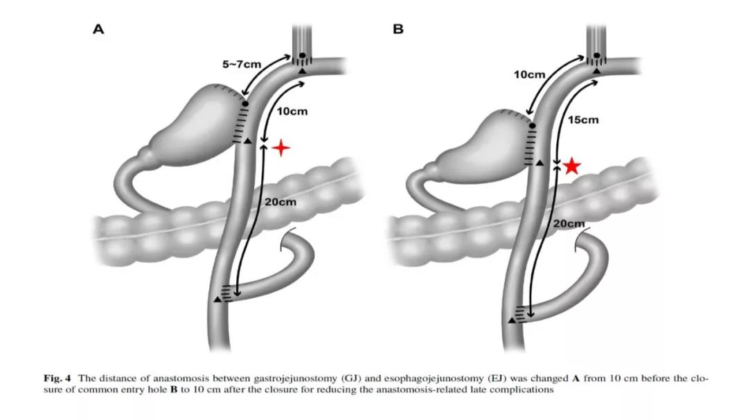 韩国首尔国立大学医学院 Bundang医院外科部Do Hyun Jung等医生,采用腹腔镜进行近段胃切除,然后采用双通道重建(DTR)的方式,而且在临床探索中不断改进,将原先食管空肠(EG)吻合口到胃空肠共同开口位点(下图A星形位置)的距离由10厘米延长到15厘米(下图B五角星位点),取得了非常好的临床结果。他们的论文发表在《内镜外科》杂志上,现在把论文的主要内容向大家介绍一下。